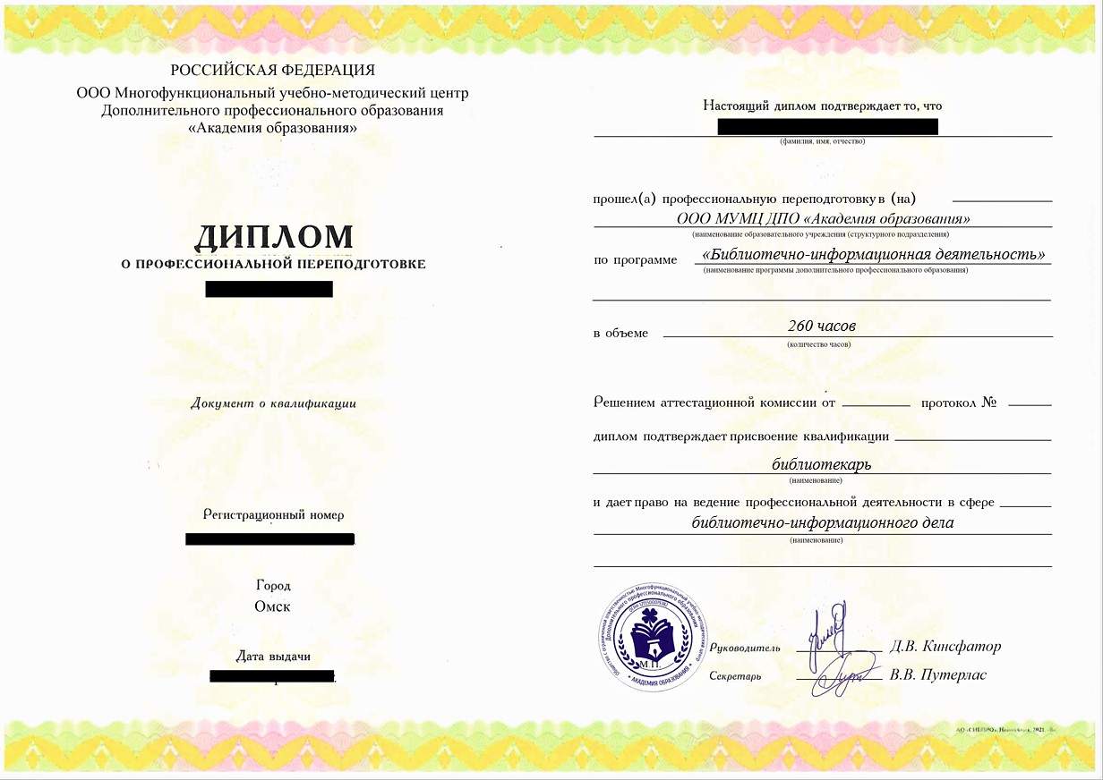 • «Библиотекарь» с правом ведения профессиональной деятельности в сфере библиотечно-информационного дела